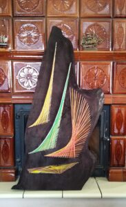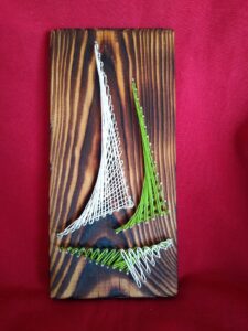Żaglówka, obraz marynistyczny wykonany na plastrze drewna. Naturalny wygląd drewna nadaje dekoracji niezwykły wyglad. Wyjątkowa dekoracja marynistyczna z bala. Niepowtarzalny kształt nadaje oryginalność morskiemu obrazu