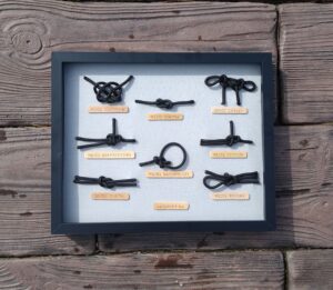 Tablica z węzłami żeglarskimi wykonana hande made w pracowni rękodzieła. Czarna rama, szare tło z tkaniny oraz węzły wykonane z czarnej liny żeglarskiej nadają tablicy