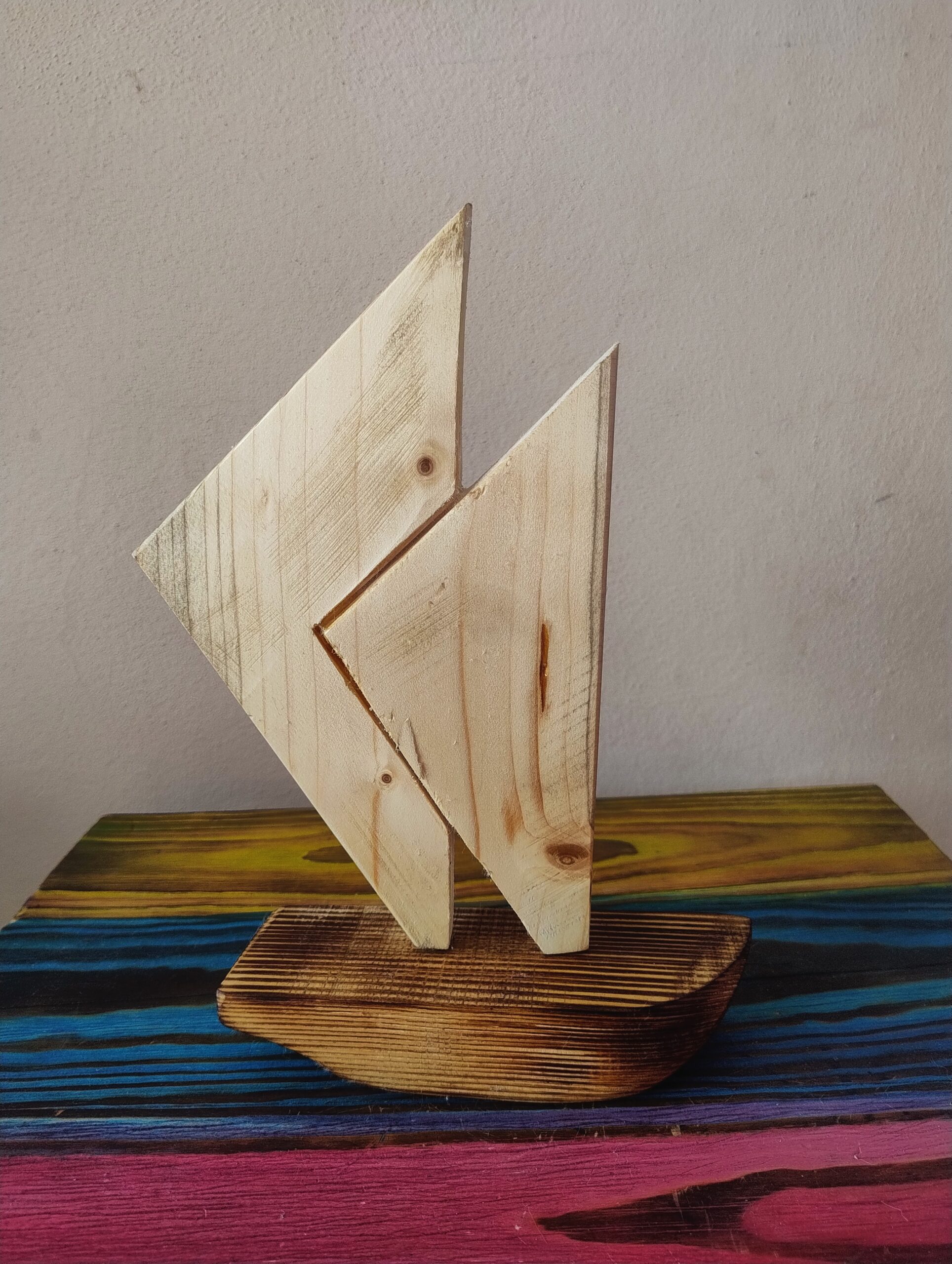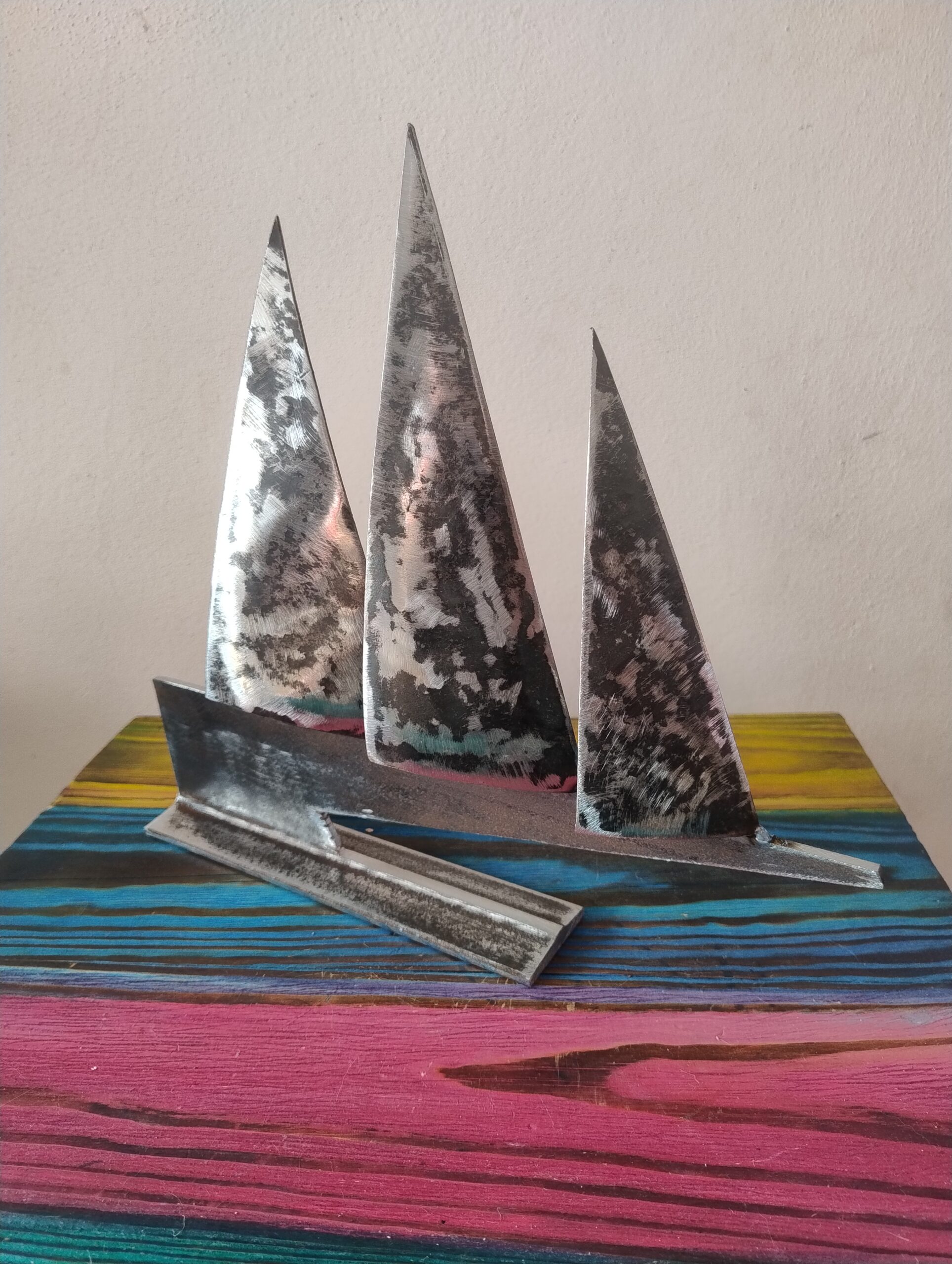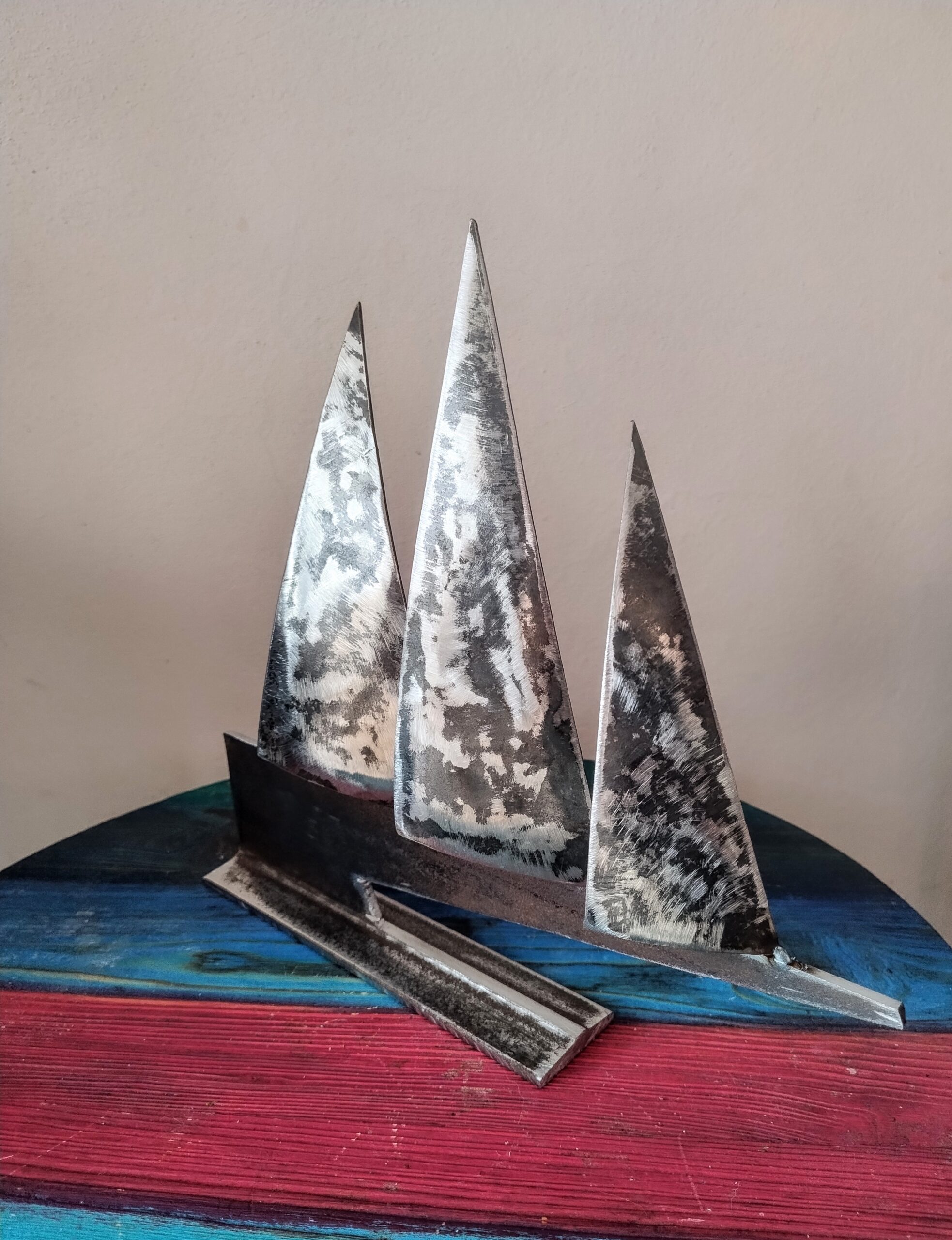to wyrazista forma inspirowana ruchem wiatru i dynamiką żeglarstwa. Trzy metalowe żagle o zróżnicowanej wysokości tworzą nowoczesną, symboliczną żaglówkę, osadzoną na solidnej, drewnianej podstawie o marynistycznej kolorystyce.